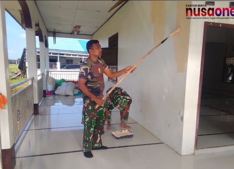 nusaone.id — Pidie Jaya – Anggota Koramil 19 Meureudu, Kodim 0102/Pidie, melaksanakan kegiatan kerja bakti berupa pengecetan dan pembersihan meunasah di Gampong Manyang Lancok, Dusun Lancok, Kecamatan Meureudu, Kabupaten Pidie Jaya, Kamis (5/2/2026).