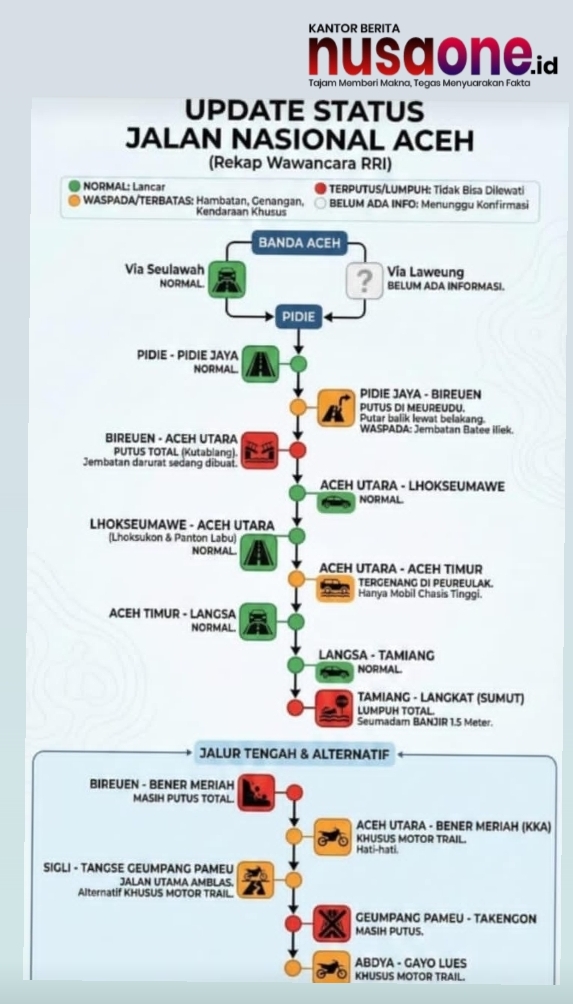 Sejumlah jalur utama dan ruas jalan nasional di Aceh hingga kini masih mengalami gangguan akibat banjir dan longsor yang melanda wilayah tersebut sejak akhir November 2025. Berdasarkan laporan terbaru dari siaran RRI, beberapa ruas sudah mulai pulih, namun sejumlah titik vital masih terputus total dan belum dapat dilalui kendaraan.