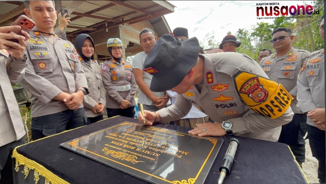 Sebagai tanda resmi peresmian, Kapolres Pidie Jaya menandatangani batu prasasti sumur bor yang diharapkan dapat memberi manfaat jangka panjang bagi masyarakat setempat.