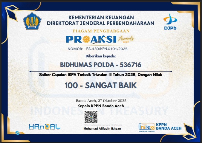 Banda Aceh — Bidhumas Polda Aceh berhasil meraih Penghargaan Proaksi Award Triwulan III Tahun Anggaran 2025 dari Kantor Pelayanan Perbendaharaan Negara (KPPN) Banda Aceh sebagai Satuan Kerja (Satker) dengan Capaian Indikator Kinerja Pelaksanaan Anggaran (IKPA) Sangat Baik, dengan nilai sempurna 100.