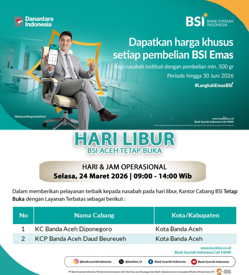 Nusaone / Banda Aceh — Dalam rangka memberikan pelayanan optimal kepada masyarakat pada momen libur panjang Idul Fitri 1447 H, Bank Syariah Indonesia (BSI) Regional Aceh memastikan tetap membuka layanan operasional terbatas di sejumlah outlet.
