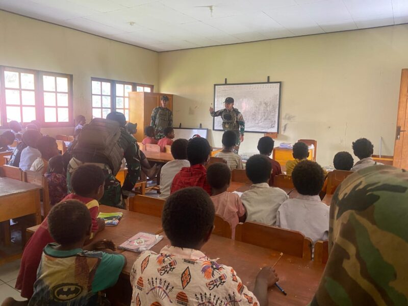 Papua Tengah – Satgas Yonif 112/DJ Pos Tinggi Nambut memberikan Wawasan Kebangsaan dan membagikan Sarana Penggalangan berupa Buku Tulis di  Sekolah dasar (SD) Inpres Distrik Tinggi Nambut, Kabupaten Puncak Jaya, Provinsi Papua Tengah, Senin (27/10/2025).