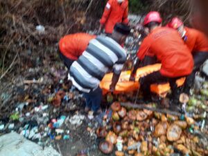 Petugas dan relawan yang tiba di lokasi langsung melakukan evakuasi terhadap korban menggunakan tandu darurat. Proses evakuasi berlangsung di area pinggir jalan dengan kondisi medan yang cukup sulit.