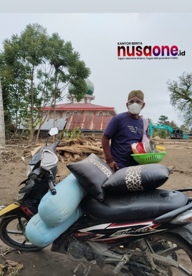 Dengan menggunakan sepeda motor, Azree terlihat mengangkut sisa perlengkapan rumah tangga seperti kasur dan peralatan dapur dari rumah yang masih dipenuhi lumpur dan material banjir.