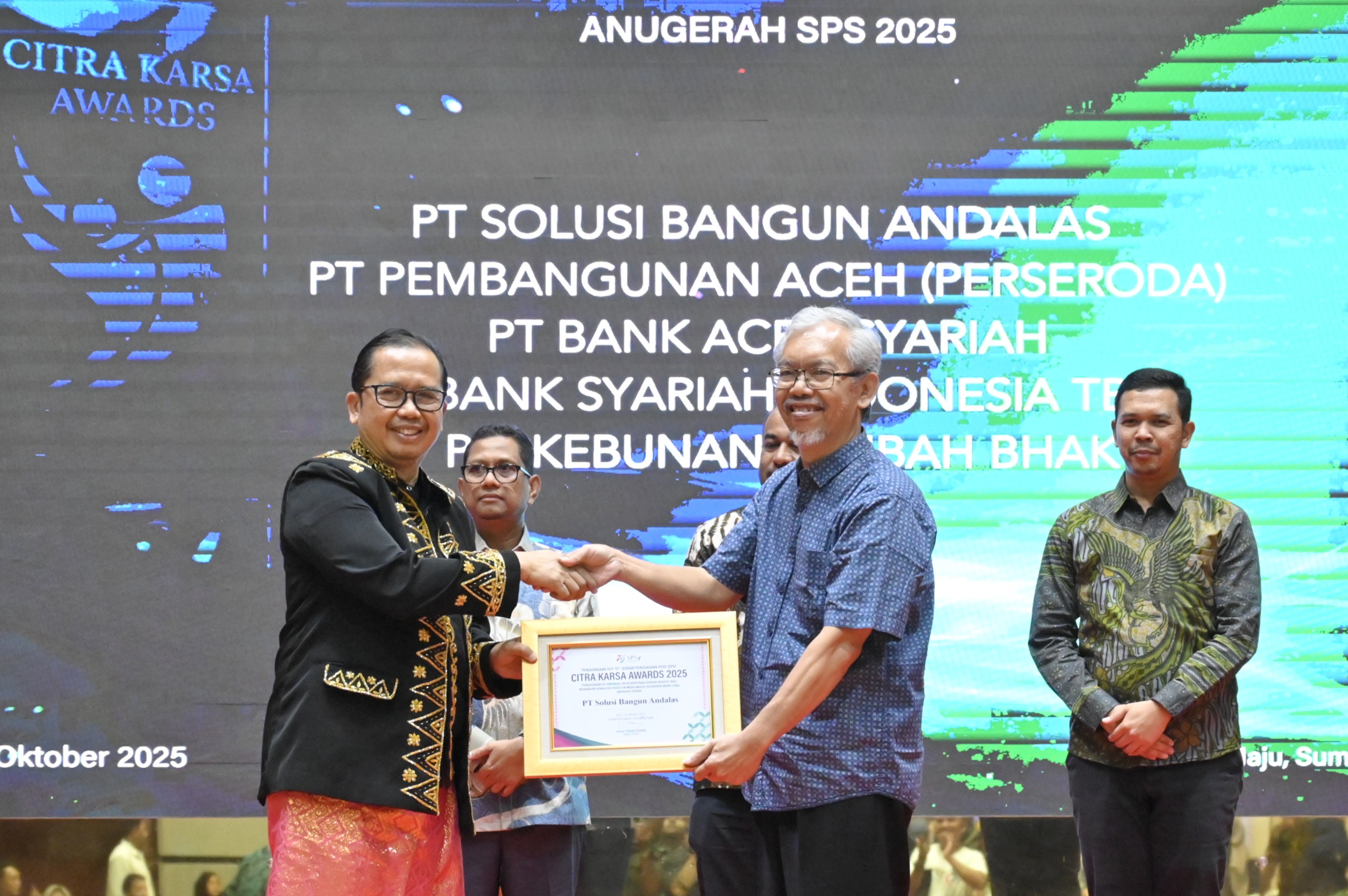 Banda Aceh, 22 Oktober 2025 – Komitmen dalam membangun komunikasi yang transparan, kemitraan, serta kolaborasi yang erat bersama insan pers mengantarkan PT Solusi Bangun Andalas (“Solusi Bangun Andalas/Perusahaan”) meraih dua penghargaan bergengsi, yakni Citra Karsa Award 2025 dan Media Relations Award (MRA) 2025 dari Serikat Perusahaan Pers (SPS) Indonesia. Kedua penghargaan ini diserahkan pada malam puncak Penghargaan ke-79 SPS yang digelar di Anjong Mon Mata, Banda Aceh, 20 Oktober 2025.