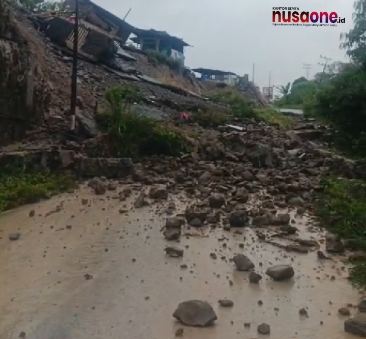 Material longsor berupa tanah basah, bebatuan berukuran besar, serta puing-puing bangunan turun dari tebing kiri jalan dan menutupi seluruh badan jalan hingga ke sisi parit di kanan.