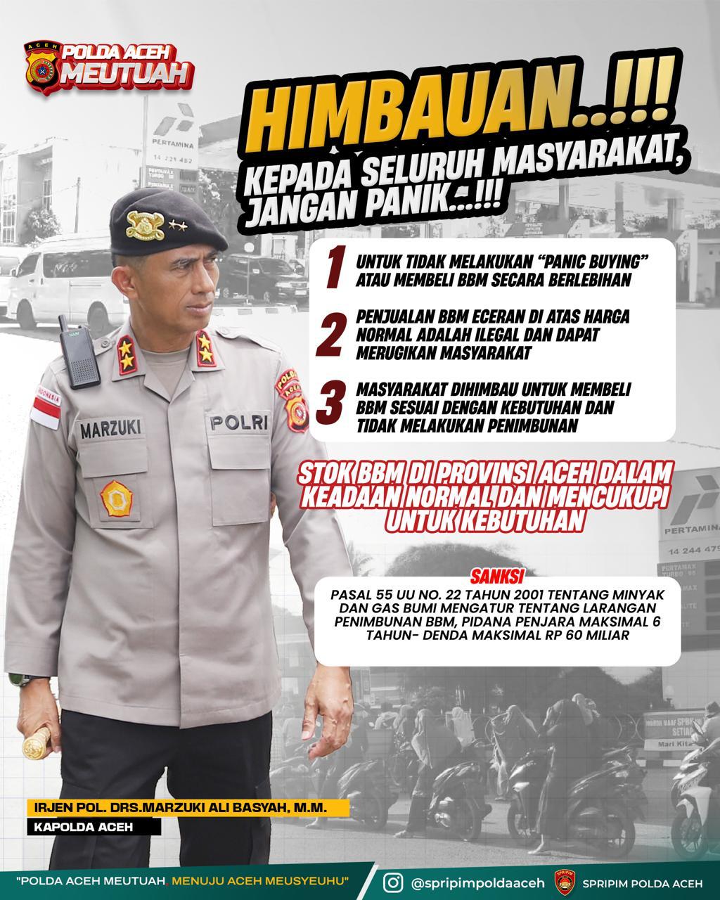 Nusaone / Banda Aceh – Kapolda Aceh Irjen Pol Drs. Marzuki Ali Basyah, M.M. mengimbau masyarakat agar tidak melakukan pembelian bahan bakar minyak (BBM) secara berlebihan atau panic buying. Pasokan BBM di wilayah Aceh dipastikan dalam kondisi aman dan distribusinya berjalan normal.