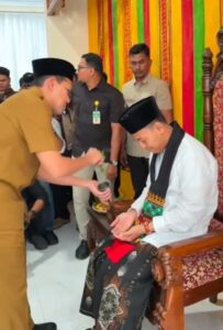 Prosesi penyambutan diawali dengan penyematan sal oleh Fadhlullah kepada Tgk Habibi di hadapan para tamu undangan.
