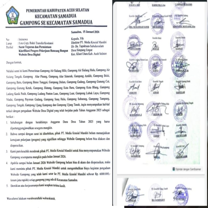 Nusaone.id |Aceh Selatan – 20 Januari 2026—Sebanyak 28 Gampong dalam Kecamatan Samadua, Kabupaten Aceh Selatan, secara resmi melayangkan surat teguran dan permintaan klarifikasi kepada PT. Media Krusial Mandiri. Langkah tegas ini diambil menyusul mandeknya proyek pengadaan Website Desa Digital yang telah dianggarkan melalui Dana Desa Tahun Anggaran 2025.
