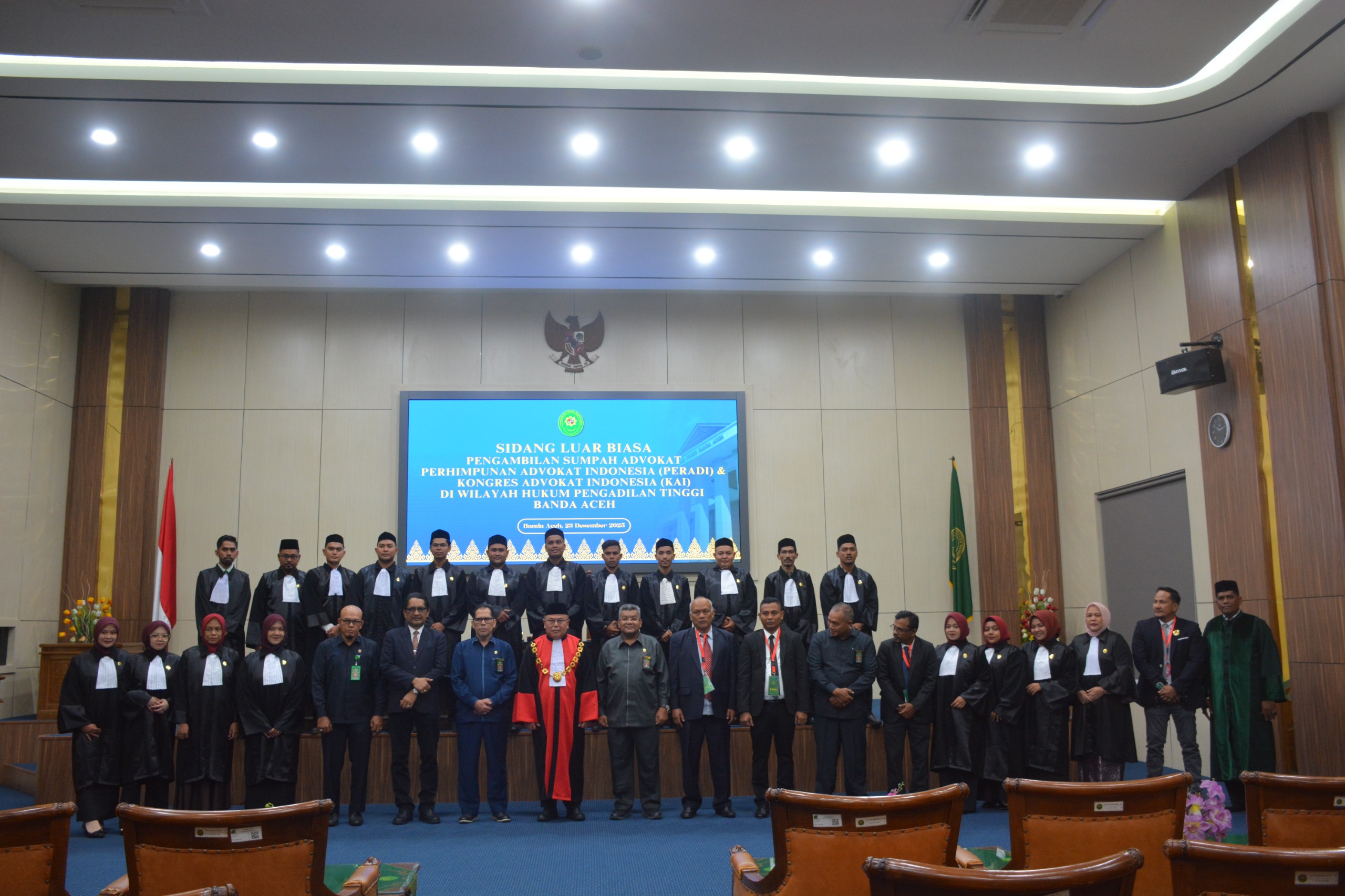 Banda Aceh, – Ketua Pengadilan Tinggi (KPT) Banda Aceh, Nursyam, SH, MHum, bertempat di Ruang Sidang Utama Pengadilan Tinggi, pada Selasa 23 Desember 2025 mangambil sumpah 20 orang Advokat yang berasal dari Perhimpunan Advokat Indonesia (Peradi) dan Kongres Advokat Indonesia (KAI).