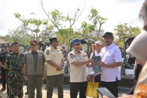 Adapun bantuan yang diserahkan meliputi sembilan unit skid loader mini, 5.000 pasang sepatu bot, 3.000 unit gerobak dorong, serta masing-masing 1.000 unit sekop dan cangkul.