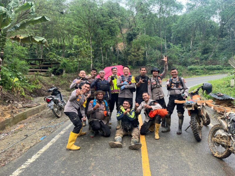 Sigli – Jalan yang terputus, lumpur tebal, tanjakan curam, serta medan pegunungan yang sulit, tidak menyurutkan langkah personel Polres Pidie dalam menjalankan misi kemanusiaan, Sabtu (13/12/2025).