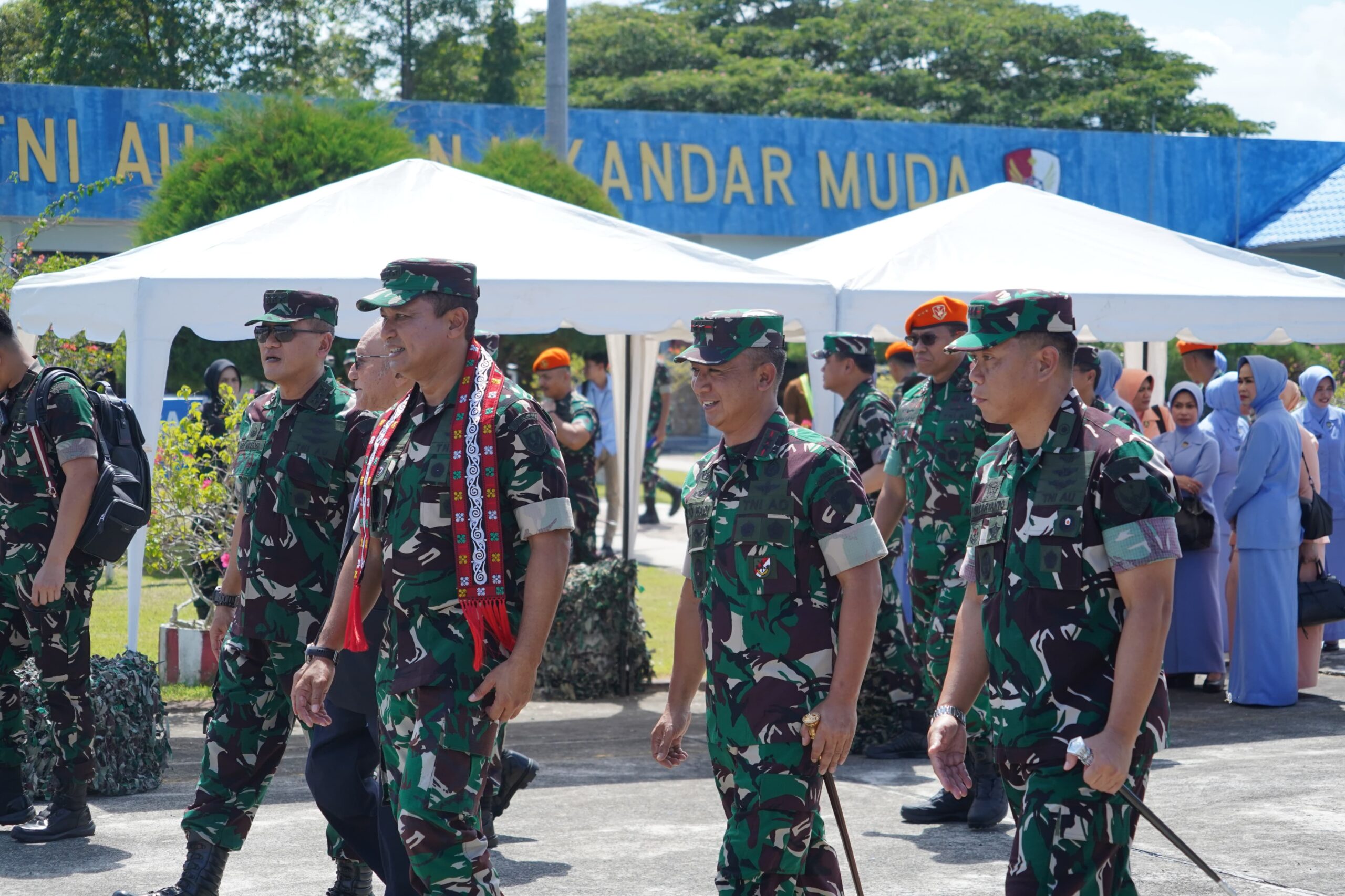 Nusaone.id |Aceh Besar – Panglima Komando Daerah Militer Iskandar Muda (Pangdam IM) Mayor Jenderal TNI Joko Hadi Susilo, S.I.P., menyambut secara langsung kedatangan Kepala Staf Angkatan Udara (Kasau) Marsekal TNI Mohamad Tonny Harjono, S.E., M.M., beserta Ketua Umum PIA Ardhya Garini, dan rombongan di Pangkalan Udara Sultan Iskandar Muda (Lanud SIM), Aceh Besar, Senin (22/9/2025) pagi.