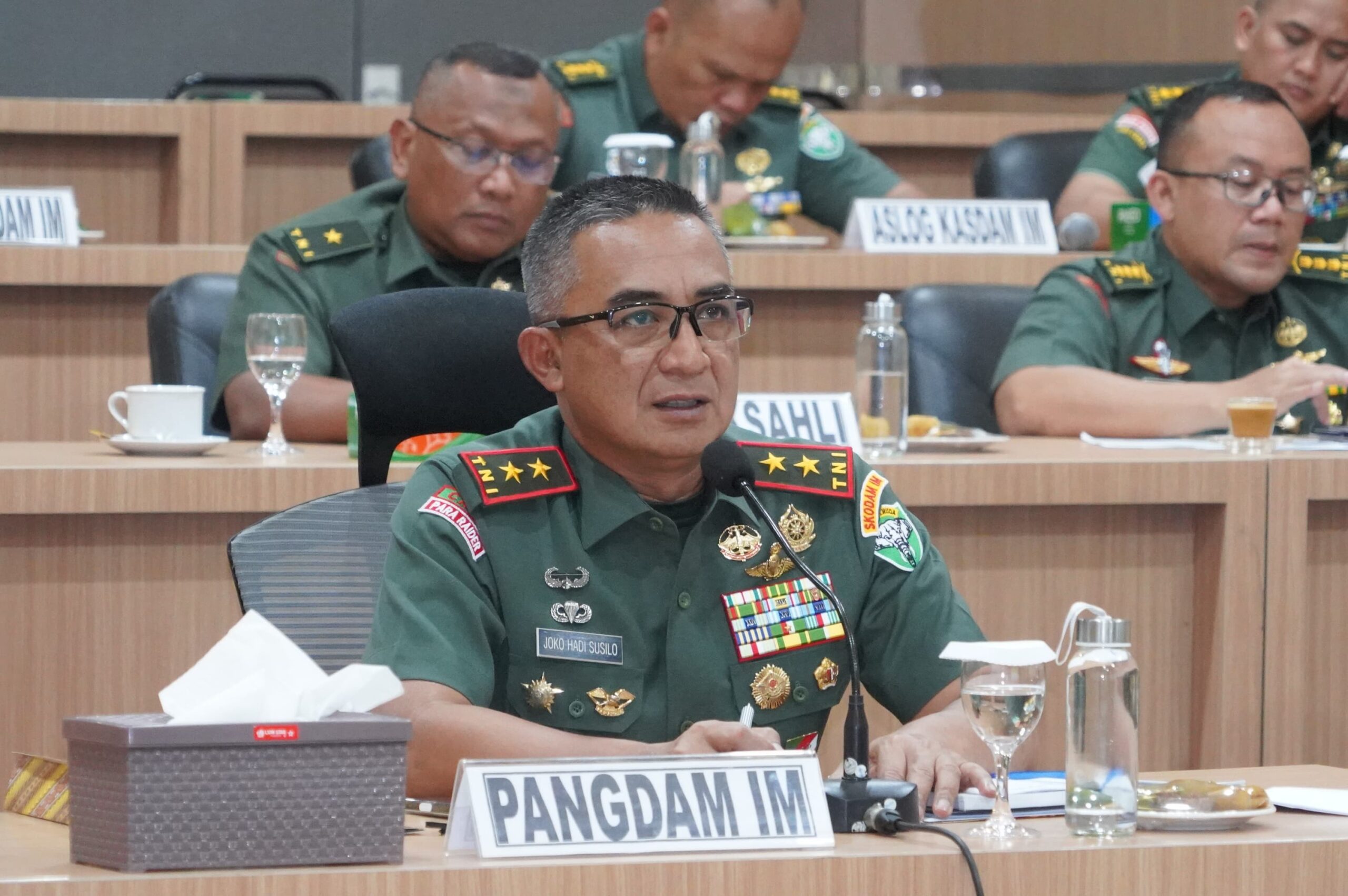 “Saya menyampaikan apresiasi dan terima kasih kepada seluruh Danrem, Dandim, dan para Komandan Satuan jajaran Kodam IM yang telah bekerja keras melaksanakan berbagai program, baik yang berasal dari pemerintah pusat, dukungan kepada pemerintah daerah, maupun kegiatan internal Kodam Iskandar Muda sendiri. Terhadap kegiatan yang sedang dan akan kita laksanakan, perlu terus dilakukan evaluasi dan inovasi agar pelaksanaannya berjalan efektif, efisien, serta tepat sasaran,” ujar Pangdam IM.