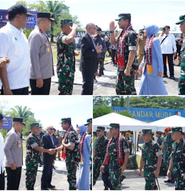 Aceh Besar – Panglima Komando Daerah Militer Iskandar Muda (Pangdam IM) Mayor Jenderal TNI Joko Hadi Susilo, S.I.P., menyambut secara langsung kedatangan Kepala Staf Angkatan Udara (Kasau) Marsekal TNI Mohamad Tonny Harjono, S.E., M.M., beserta Ketua Umum PIA Ardhya Garini, dan rombongan di Pangkalan Udara Sultan Iskandar Muda (Lanud SIM), Aceh Besar, Senin (22/9/2025) pagi.