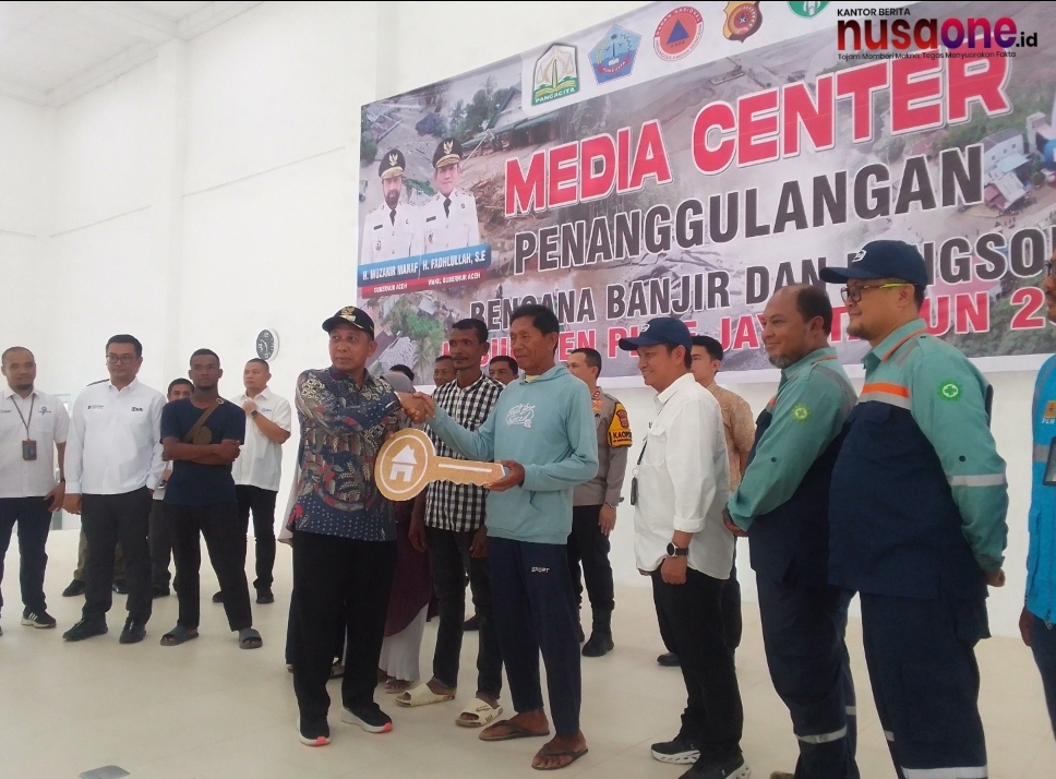 nusaone.id – Pidie Jaya – Sibral Malasyi menyerahkan secara simbolis kunci hunian sementara (huntara) kepada masyarakat terdampak banjir dan longsor, Sabtu, 14 Februari 2026, pukul 11.15 WIB.