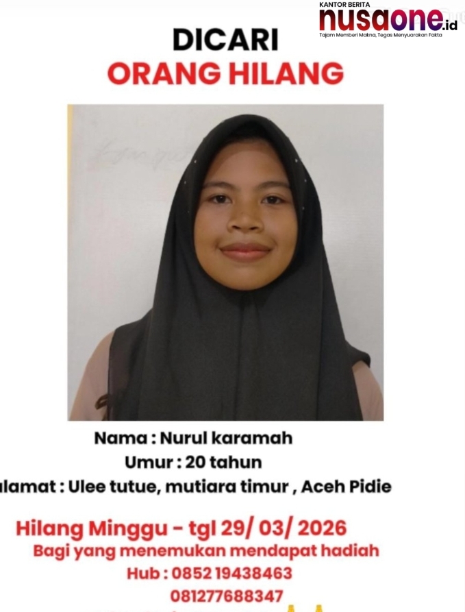 nusaoe.id – Pidie— Seorang perempuan muda berusia 20 tahun, Nurul Karamah, dilaporkan hilang sejak Minggu, 29 Maret 2026. Hingga kini, keberadaannya masih belum diketahui dan terus dalam pencarian oleh pihak keluarga.