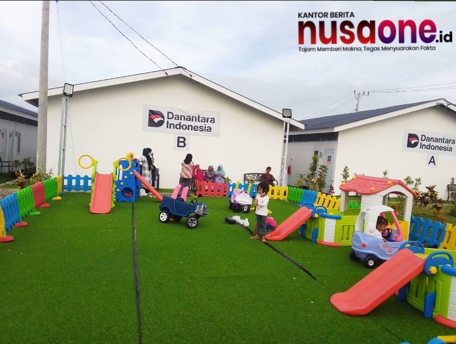 Di kawasan yang sama, suasana ceria tampak menghiasi lingkungan huntara. Sejumlah anak-anak terlihat bermain di taman yang telah disediakan di depan deretan bangunan.