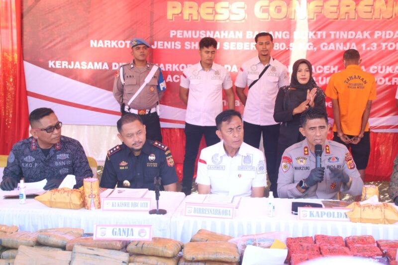 Banda Aceh — Ditresnarkoba Polda Aceh bersama Badan Narkotika Nasional Provinsi (BNNP) Aceh, Direktorat Jenderal Bea dan Cukai, Polresta Banda Aceh, Polres Aceh Timur, Polres Gayo Lues, dan Polres Sabang berhasil menggagalkan peredaran narkotika jenis sabu seberat 80,5 kilogram, ganja 1,3 ton, serta kokain 1 kilogram dalam kurun waktu tiga bulan terakhir.