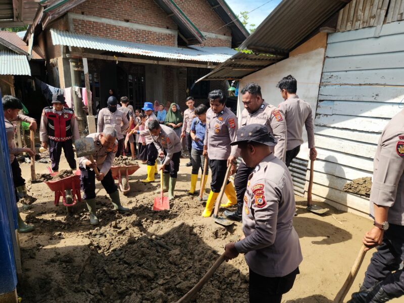 Personel Polres Pidie melaksanakan pembersihan sisa lumpur, sampah, serta material yang terbawa arus banjir di dalam dan sekitar rumah.