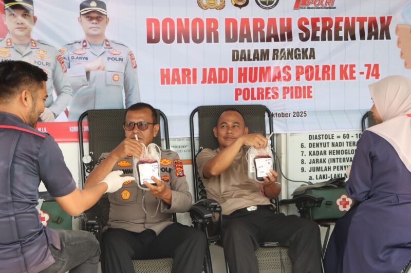 Sigli – Dalam rangka memperingati Hari Jadi Humas Polri ke-74 Tahun 2025, Polres Pidie melalui Seksi Humas bekerja sama dengan Seksi Dokkes dan Palang Merah Indonesia (PMI) Kabupaten Pidie menggelar kegiatan Bakti Kesehatan Donor Darah pada Rabu (22/10/2025).