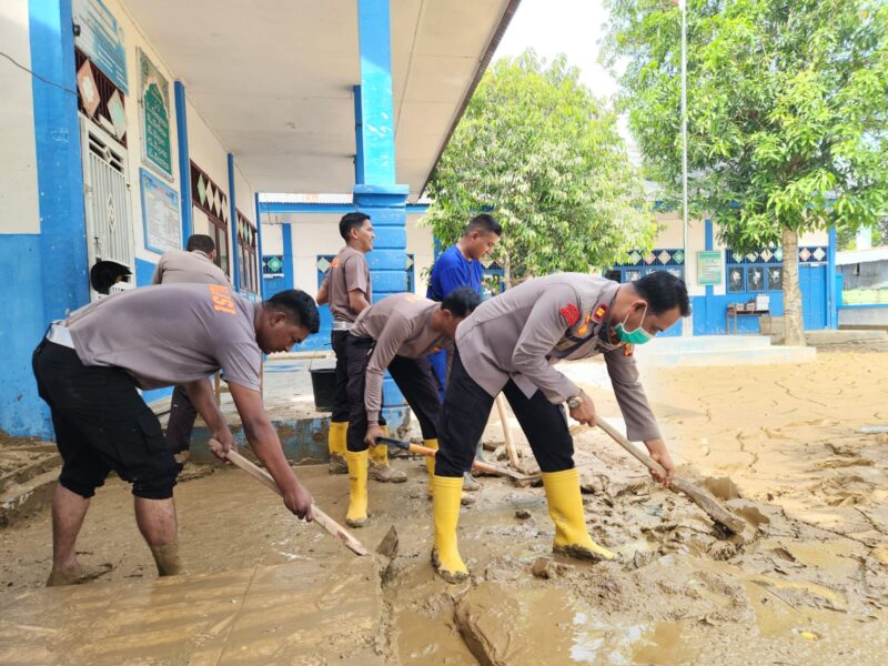 Sigli – Personel gabungan Polres Pidie melaksanakan kegiatan gotong royong membersihkan lumpur sisa banjir di SD Negeri Kandang, Kecamatan Kembang Tanjong, Kabupaten Pidie, Kamis (11/12/2025).