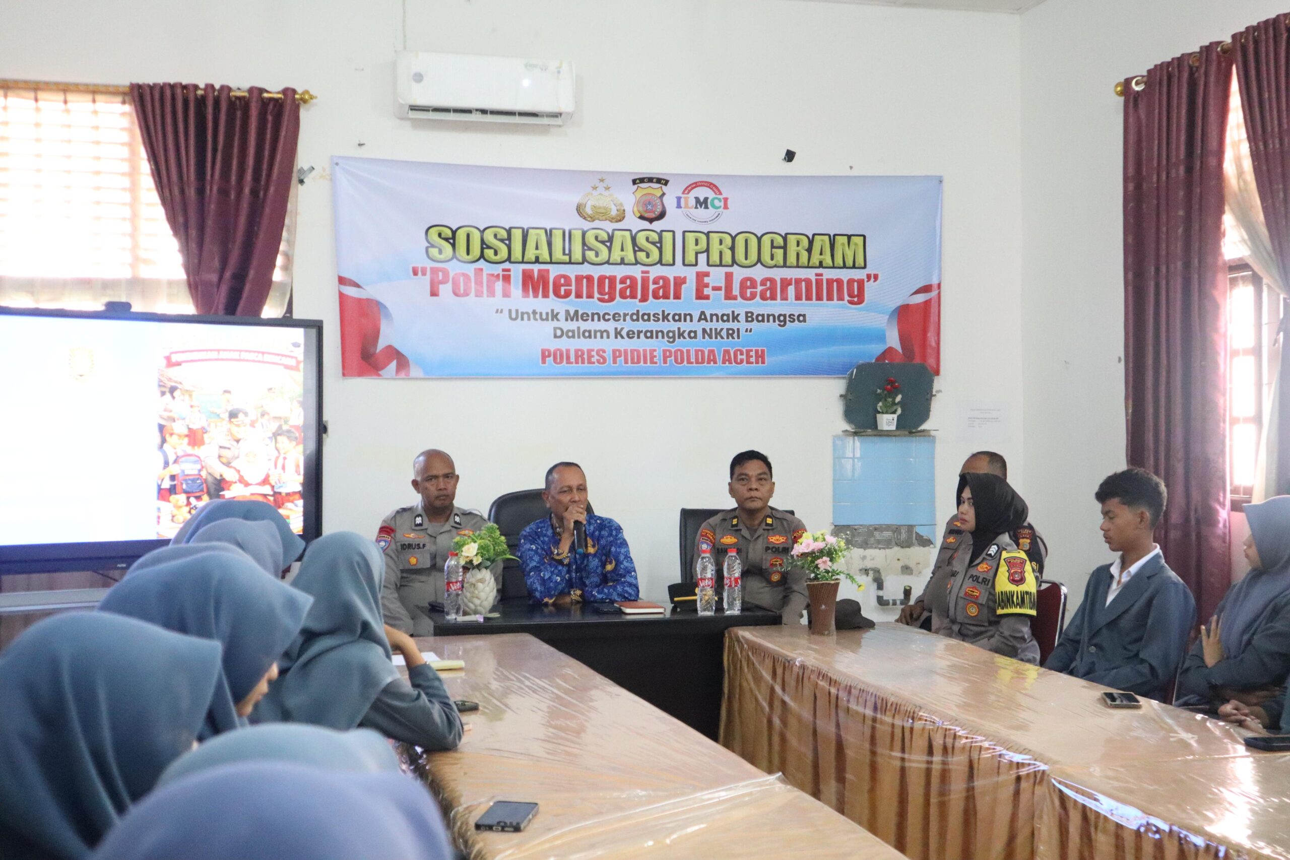 Kapolres Pidie AKBP Jaka Mulyana, SIK, MIK melalui Kasat Binmas AKP Zulfikar, SH menyampaikan bahwa Program Polri Mengajar E-Learning merupakan salah satu upaya Polri dalam memperluas akses pendidikan secara merata melalui pemanfaatan teknologi digital.