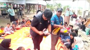 Rijal Rinata, salah satu Ketua Radio Antar Penduduk Indonesia (RAPI), Ketua Taruna Siaga Bencana (TAGANA), sekaligus mantan Anggota DPRK Calang, Kabupaten Aceh Jaya, menggelar kegiatan hiburan bagi anak-anak korban banjir di posko dapur umum Dusun Lancok, Gampong Manyang Lancok, Kecamatan Meureudu, Kabupaten Pidie Jaya, Minggu (14/12/2025).