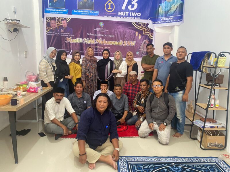 nusaone.id. Banda Aceh – Pengurus Wilayah Ikatan Wartawan Online (PW IWO) Aceh memperingati Maulid Nabi Muhammad SAW 1447 H, Rabu (11/9/2025), di Banda Aceh. Acara berlangsung khidmat dengan dihadiri Ketua PW IWO Aceh Chairan Manggeng, jajaran pengurus, serta anggota IWO dari berbagai daerah, termasuk Arju Na Fahlefi dari Kabupaten Pidie Jaya.