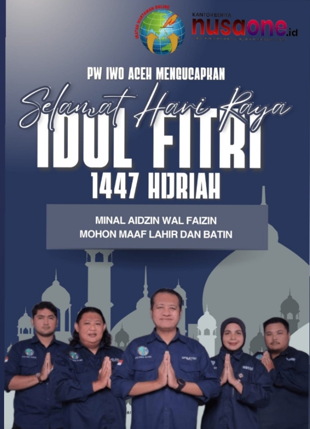 nusaone.id – Banda Aceh – Pengurus Wilayah Ikatan Wartawan Online (PW IWO) Aceh menyampaikan ucapan selamat Hari Raya Idul Fitri 1447 Hijriah kepada seluruh masyarakat, khususnya di Aceh, sebagai momentum mempererat kebersamaan dan saling memaafkan.