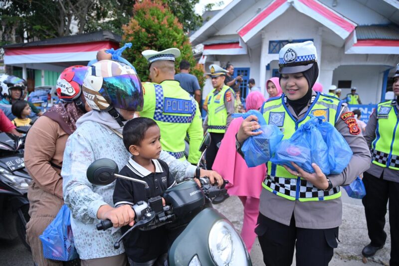 Nusaone / Sigli – Dalam semangat berbagi di bulan suci Ramadhan 1447 Hijriah, Satuan Lalu Lintas Polres Pidie bersama Bhayangkari Cabang Pidie menggelar kegiatan pembagian takjil kepada masyarakat di Kota Sigli, Minggu (1/3/2026) sore.