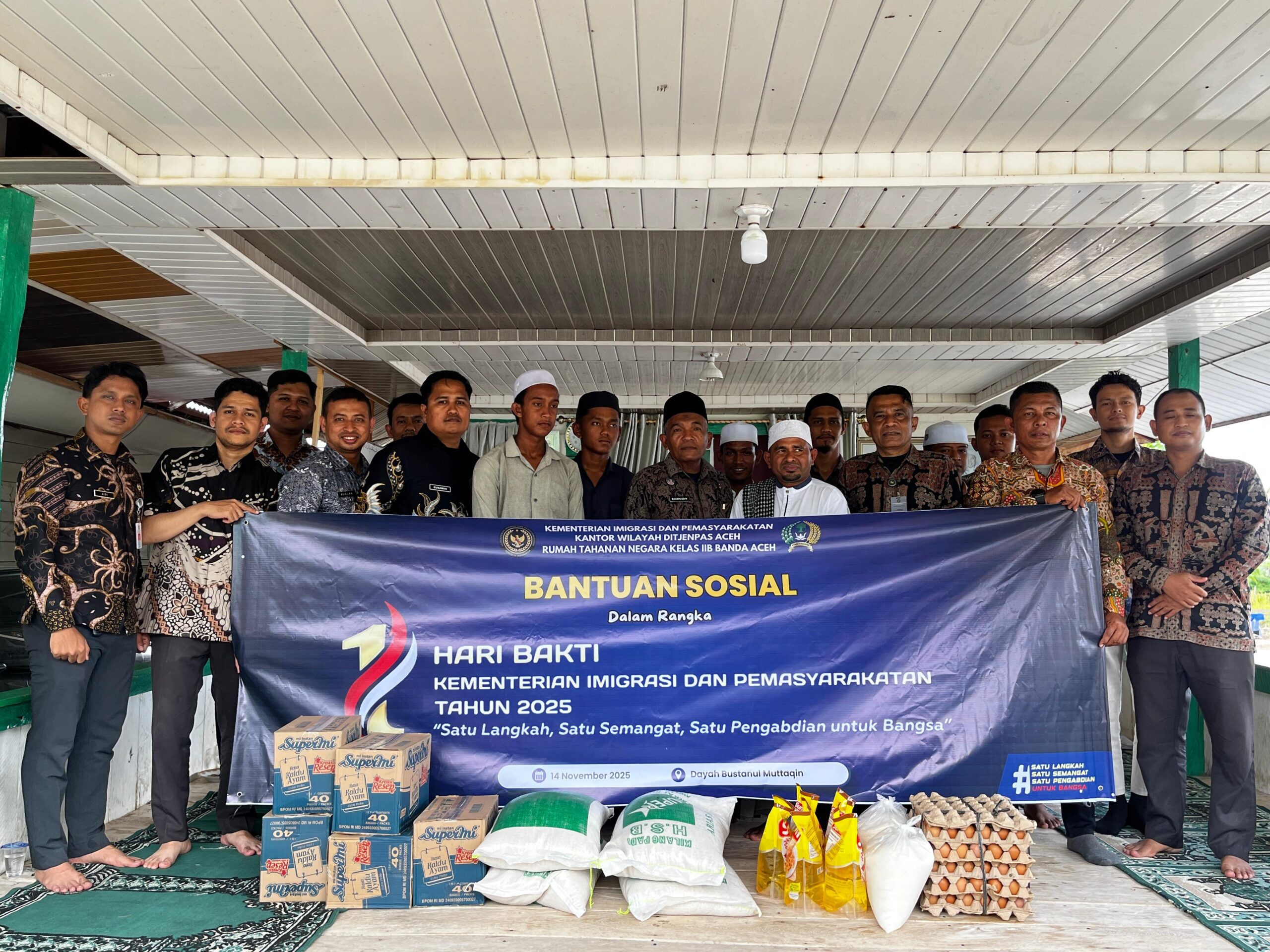 Nusaone.id |Aceh Besar – Dalam rangka memperingati Hari Ulang Tahun Kementerian Imigrasi, dan Pemasyarakatan yang pertama, Rutan Banda Aceh melakukan kegiatan penyerahan bantuan sosial di Dayah Bustanul Muttaqin, Desa Labuy, Aceh Besar, pada Sabtu (15/11/2025).