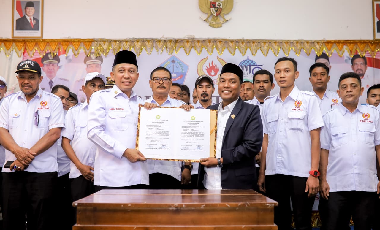 nusaone.id. Pidie Jaya – Bupati Pidie Jaya, H. Sibral Malasyi MA, S.Sos, ME, resmi dilantik sebagai Ketua Umum Komite Olahraga Nasional Indonesia (KONI) Kabupaten Pidie Jaya periode 2025-2029. Pelantikan yang berlangsung di Aula Cot Trieng I Kantor Bupati Pidie, Kamis (11/9/2025), turut dihadiri Ketua KONI Aceh, unsur Forkopimda, DPRK, Kapolres, Dandim, Kajari, Ketua Pengadilan Negeri, Mahkamah Syariah, MPU, serta para pengurus cabang olahraga.