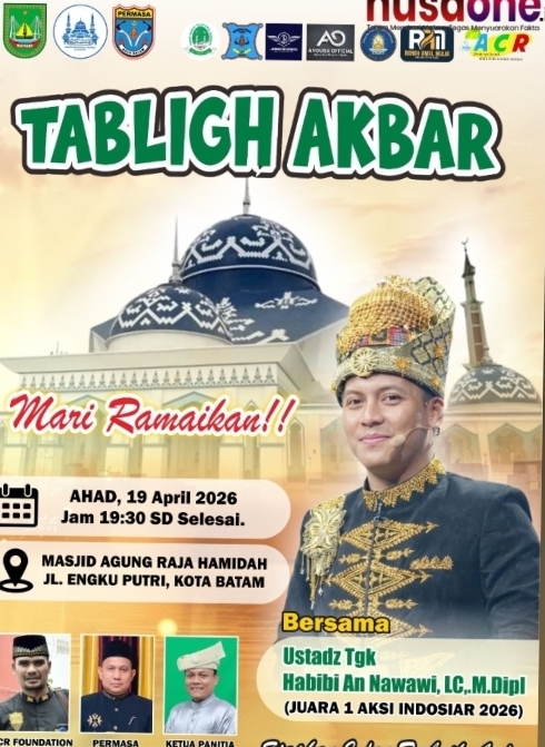 Tabligh Akbar akan digelar di Masjid Agung Raja Hamidah, Kota Batam, pada Ahad, 19 April 2026, mulai pukul 19.30 WIB hingga
