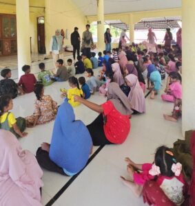 Selanjutnya, Mursyidah menyampaikan materi Trauma Healing dan pengenalan SIBAD (Siaga Bencana Desa). Materi disampaikan dengan bahasa sederhana agar mudah dipahami oleh anak-anak, sekaligus menanamkan pemahaman dasar tentang kesiapsiagaan bencana.