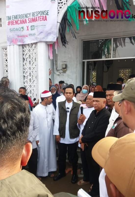 Ustaz Abdul Somad (UAS) hadir di tengah warga terdampak banjir bandang di Gampong Pante Geulima, Kecamatan Meureudu, Kabupaten Pidie Jaya, Jumat (26/12/2025) ba’da Salat Jumat. Kehadiran dai nasional tersebut memberikan motivasi, tausiyah keagamaan, serta bantuan bagi para korban bencana.