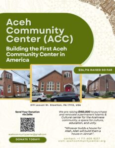 Komunitas Aceh di Harrisburg, Pennsylvania, Amerika Serikat, mencatat tonggak penting dengan berhasil membeli sebuah gedung yang sebelumnya merupakan gereja untuk dijadikan Aceh Community Center (ACC). Fasilitas ini akan difungsikan sebagai pusat kegiatan ibadah, pendidikan, dan pelestarian budaya Aceh di Amerika.