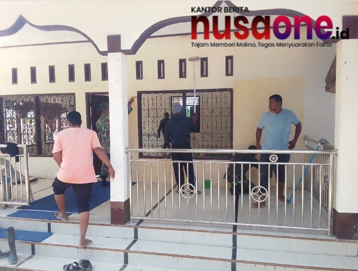 Sejak pagi hari, warga bersama beberapa anggota Koramil 19 Meureudu terlihat bahu-membahu membersihkan bagian dalam dan luar mushalla.