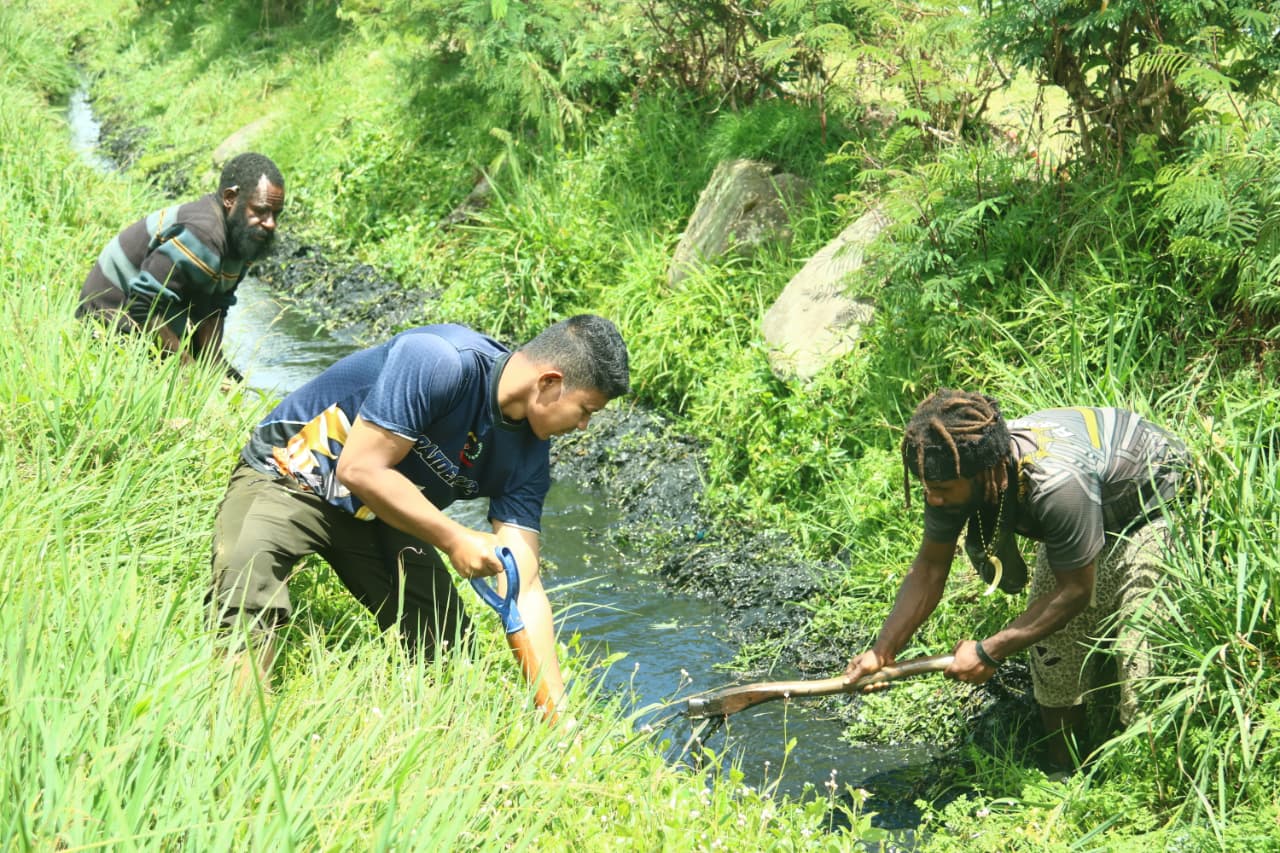 Puncak Jaya – Dalam rangka menjaga kondisi lingkungan supaya selalu terlihat bersih dan rapi, Satgas Pamtas RI-PNG Yonif 112/DJ Pos Kota Baru bersama warga gelar gotong royong di Kampung Pagaleme Distrik Mulia Kab. Puncak Jaya Prov. Papua Tengah, Selasa (09/12/2025).